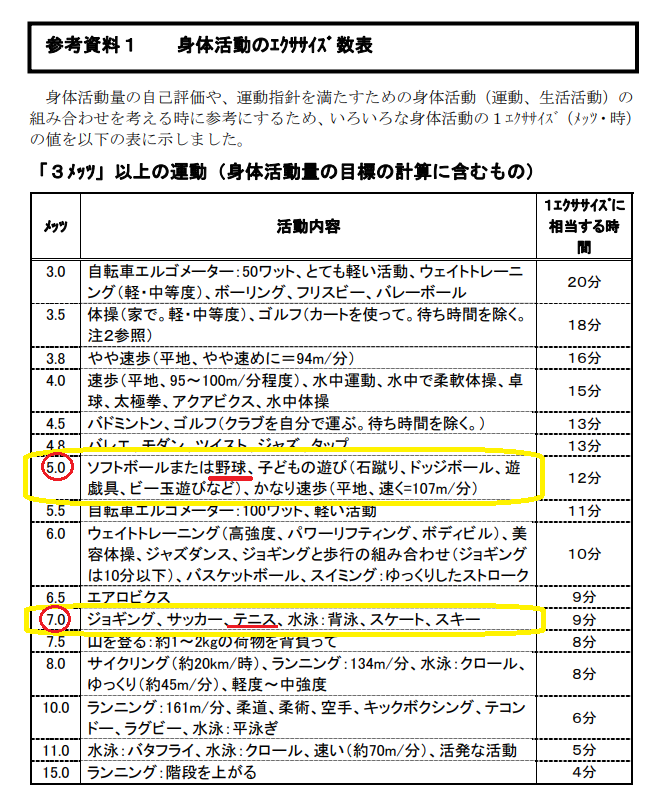 野球のメッツは5.0。ソフトボールと同程度で、テニスの7.0よりも小さく運動強度は高くないことが確認出来ます。